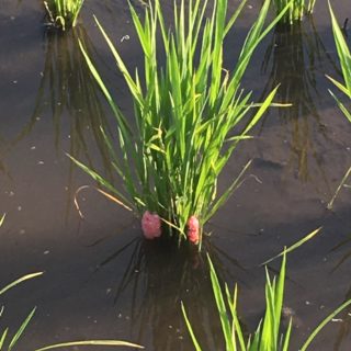 卵を見つけた場合には、水中に落としましょう。鮮やかなピンク色の段階では、水中では孵化できません。孵化直前には黒っぽくなるので、この段階では潰してしまう必要があります。