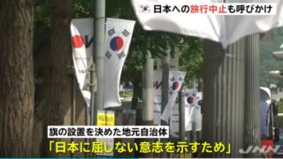 日本製品の不買運動と旅行中止を呼びかける旗、1100本を設置する作業が始まり