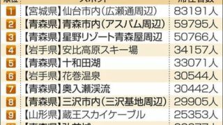 7位が奥入瀬渓流の3万442人、8位が三沢市内(三沢基地周辺)の2万9905人、