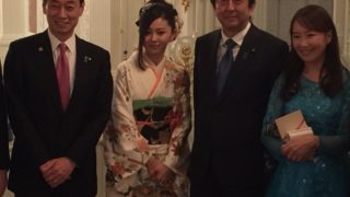 ・左から、内閣官房副長官・西村康稔、倉木麻衣、安倍総理大臣、アグネス・チャン
