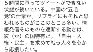 5時間に亘ってツイートができない状態が続いている。中国の“五毛党”の仕業か。リプライにもそれと思われるものがここのところ多い。情報発信そのものを遮断する動きは、彼(か)の国特有だ。「自由・人権・民主」を求めて戦う人々を心から応援したい。
