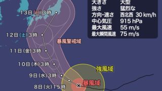 その後やや勢力を落とすものの、三連休初日の12日(土)には紀伊半島沖を北上し、13日(日)3時には中心付近の気圧は955hPa、中心付近の最大風速は40m/sと強い勢力で、関東地方を中心とする予報円の中に進む見込みです。