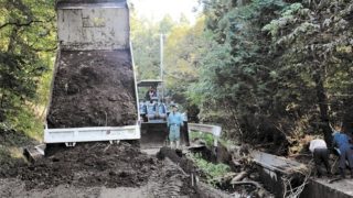 「砂利を流してくれ」。17日午前10時すぎ、大型特殊免許を持つ 鷲ノ平(わしのひら)集落の土木作業員渡辺孝晴さん(67)が重機を操り、 地域住民と協力してぬかるんだ路面を補強していた。