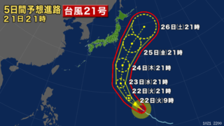 気象庁によると、台風21号は21日午後9時の観測で、「強い台風」から「非常に強い台風」になった。