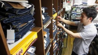 ジーンズショップ・スズヤのジーンズ売り場。店主の青山さんは「ジーンズ好きな若者が減った」と話す