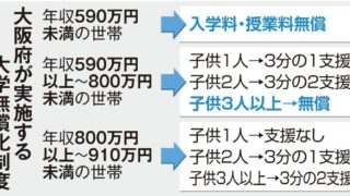導入に必要な財源は、来年度で約11・6億円。両大学の統合後も無償化制度は継続する方針。府は来年2月の府議会に予算案を提出する。吉村洋文知事は13日の定例会見で「将来的には学び直しをしたい社会人らも無償化に入れたい」と対象拡大の意向を示した。