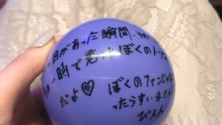 〜』で、高橋が会場のファンに投げたサインボール。実物には、「ぼくのファンじゃなかったらすいません ぴえん」などと書かれていた