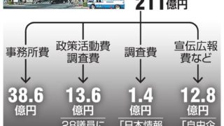 支出で際立つのは約38億6千万円の「事務所費」だ。事務所費は通常、かかった税金や修繕費、保険料などが含まれ、「国会議員関係政治団体」なら1万円超の支出の明細を記載しなければならない。しかし、政党本部は経常経費の内訳を記載する義務がなく、総額しか書かれていない。