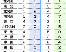 ブロック別でみると、東京で増える以外はほとんどで減り、北陸信越、中国、四国ではゼロとなる。