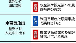 実現可能な放出方法として「希釈して海洋に放出する」「蒸発させて大気に放出する(水蒸気放出)」「併用」の3案を示しており、同日の会合で議論する。