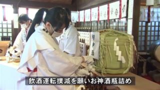 広島県福山市の神社では、巫女たちが飲酒運転撲滅の願いを込めて、お神酒(みき)の瓶詰めを行いました。