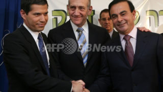 > 2008年1月21日、イスラエルのエルサレム(Jerusalem)で、電気自動車展開で合意後にイスラエル首相とゴーン笑顔で握手を交わす