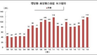 2019年(1-12月)の「理容業・美容業」倒産は、バブル末期の1989年以降の30年間で最多の119件に達した。