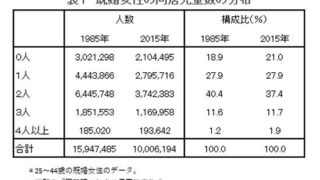 25〜44歳の既婚女性を取り出し、同居している児童数(子ども数)の分布を、1985年と2015年で比べると<表1>のようになる。