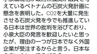 小泉環境相が政府系機関が融資を考えているベトナムの石炭火発計画に懸念を表明した。