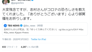 大変残念ですが、志村さんがコロナの恐ろしさを教えてくれました。「ありがとうございます」心より御冥福をお祈りします。 https://t.co/JSXoiQyP1x