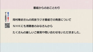 番組ラストに「番組からのおことわり」と題したテロップを流し、「岡村さんは、自身の発言は不適切なもので、多くの人に不快な思いをさせてしまったと深く反省しています。私たちも皆さまからの声を真摯にうけとめ、これからも心から楽しんでいただける情報をお届けしてまいります」と伝えた。