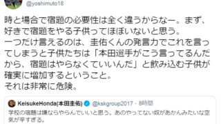 せやけど、本田や本田の周りでは宿題しなくてもやっていけてる奴が多い→宿題いらんやろ→世界に発信の流れは自分の付き合いの範囲が狭いというのを知らしめる結果でしかないように思うわ