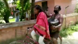 故郷に帰り着いた後も、父を後ろに乗せて村を自転車で走るインドの少女ジョティ・クマリさん=21日、東部ビハール州ダルバンガ(ビデオ映像より)(ロイター時事)