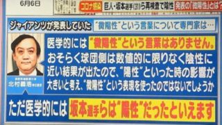 昨日のアッコにお任せでも、医師が「微陽性という言葉はない。巨人の2人はコロナ陽性だ。」とコメントしてたな。