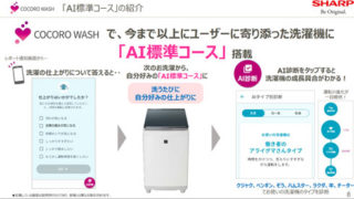 シャープは、手軽さを維持しながらユーザーの好みを反映するため、自動的に変更を加える「AI標準コース」を開発。洗濯の後、アプリがユーザーに仕上がりを訊ね、次の洗濯に結果を反映する仕組みだ。例えば「汚れが気になる」「しっかりすすぎたい」といった項目にチェックが入ると次回から洗濯時間やすすぎ時間を延ばす。これを繰り返すことで「洗うたびにユーザー好みの仕上がりに近付く」としている。