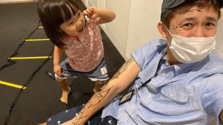 写真にはいたずらっぽい笑顔をした娘・千笑ちゃんが一緒に写っており、金田は「今日もこれから
