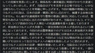 まあ、この協会も真っ黒で、トルコ政府に対してのデモ(なんで日本国内でやるのかわからない)を組織したり、偽装難民申請や、不法滞在で拘束されてるクルド人の支援事業を行っているから、今回のデモの火消しに協会の声明を使うのはいいとして、協会が真っ当だとか、クルド人はいい奴らだ、なんて思わない方がいいよ。