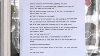 15日早朝、トーランス市で、日本人経営の調理器具の店に、「日本へ帰れ。言うことを聞かないと爆破する」などと書かれた脅迫文が貼られているのが見つかった。