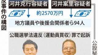 自民党から立候補した参院議員の河井案里容疑者(46)=広島選挙区=が初当選した2019年参院選を巡り、東京地検特捜部は18日、夫で前法相の衆院議員、克行容疑者(57)=自民・広島3区=と案里容疑者(いずれも離党)を公職選挙法違反(買収)の疑いで逮捕した。法務行政のトップを務めた前法相と妻の現職議員2人が逮捕される前例のない選挙違反事件に発展した。捜査の課題や事件の背景を探った。