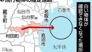 飛行物体は、蔵王町役場周辺から村田町役場の上空を飛行し、沿岸方面へ。同午後3時40分、曇り空になったことで県石巻合同庁舎(石巻市)から見えなくなり、仙台湾の海上で見失った。同午後5時、県の領域から離れたと判断し、落下物も確認されなかったことから、対応を打ち切った。