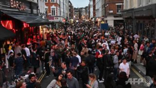 ロンドンの繁華街ソーホー(Soho)には陽気に酒を楽しむ人々があふれ、マンチェスター(Manchester)のパブは客で満員になった。