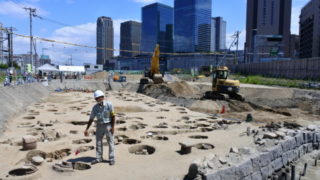 発掘調査はうめきた再開発事業に伴って始まり、2017年2〜6月の調査では、墓地の南北端の石垣や約200体の埋葬人骨が見つかった。19年9月から始まった今回の調査では、北を上として逆L字のような形とみられる梅田墓の東半分を発掘し、東端の石垣を見つけた。敷地内では亡くなった人が木おけや四角い木棺、かめ棺に入れて整然と土葬され、火葬後に埋葬したものもあった。