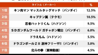 第3位(9.5%)には、1986年に発売された『忍者ハットリくん 〜忍者は修行でござるの巻〜』(ハドソン)がランクイン。同作は、発売前から雑誌『コロコロコミック』(小学館)などで特集され、150万本を売り上げる大ヒットを記録。これは漫画原作のファミコンソフトの中では第1位のセールスとなる。