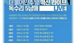 中央には「共に民主党革新ライブ ハゲ鷲5兄弟(科学忍者隊の韓国での呼び方)」との文字と「水害被害と新型コロナウイルス拡散により党大会と党の主要課題が行き詰っている状況!これを突破するためハゲ鷲5兄弟が党の主要課題をYouTubeライブで進行します」との説明が書かれている。