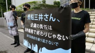 インド洋の島国モーリシャス沖で発生した日本の貨物船の重油流出を巡り、環境保護団体グリーンピース・ジャパンが25日、東京都港区の商船三井本社前で、船を手配した同社に「油汚染事故を繰り返さないで」などと訴える活動を行った。