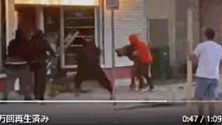 高齢女性の店主が店を守ろうとして、黒人略奪集団に殴打され暴力を受ける。