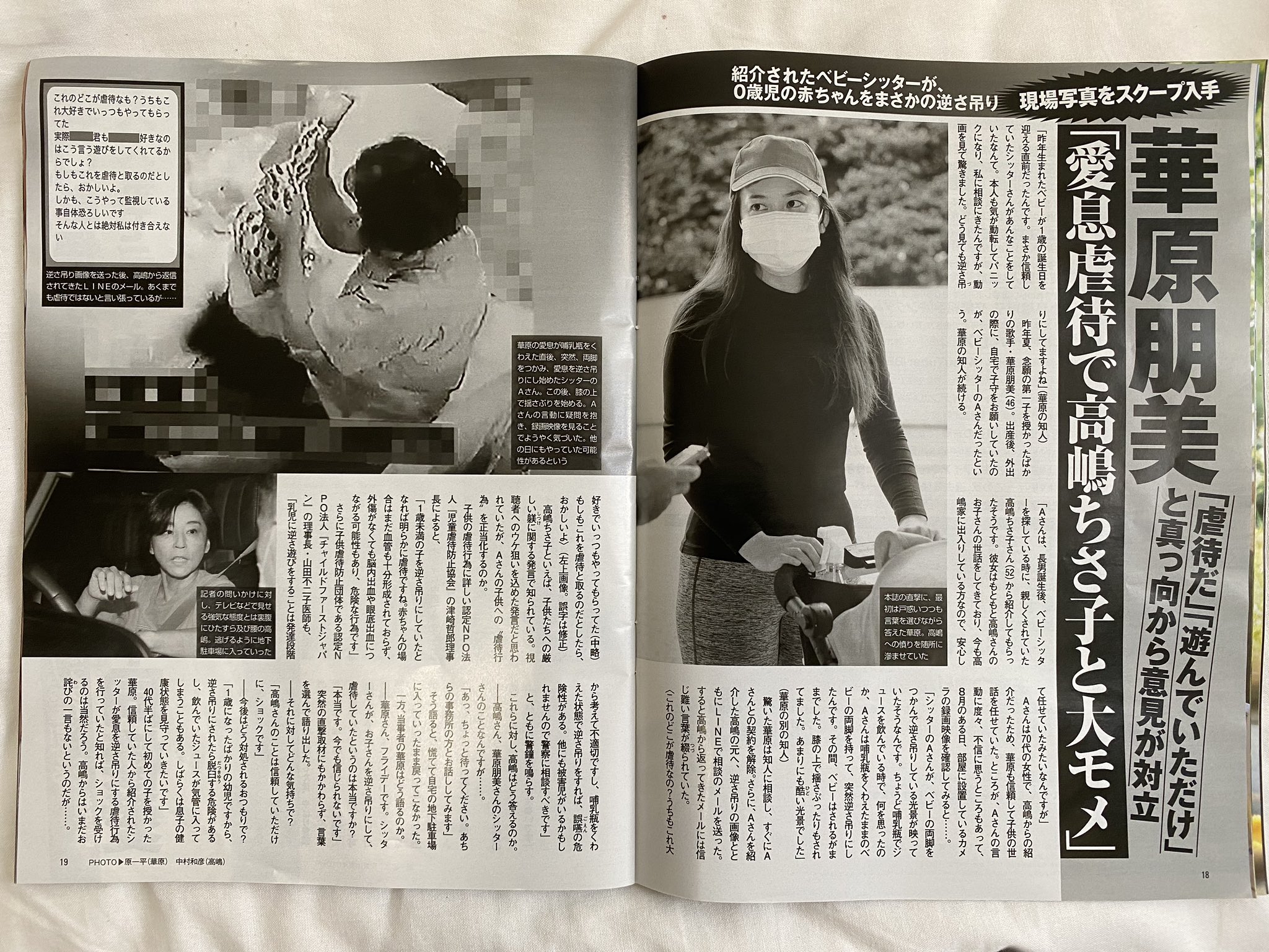 9月11日(金)発売のフライデーでは、ベビーシッターが華原の長男を逆さ吊りにしている現場写真を掲載し、華原、高嶋双方への直撃取材の様子を詳報している。