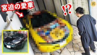 数日後、宣伝カーに生まれ変わったBMW i8は、カバーをかけた状態で宮迫宅の車庫へ。何も知らずにやってきた宮迫はカバーを外すと呆然。ネタバラシのためにスタッフがやってくると、「マジかよ……お前、これどうすんねん……」と漏らした。