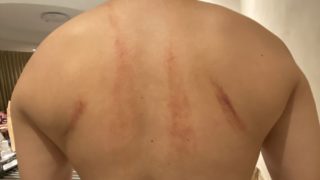 「マッサージ行ったら背中がエグいことに!」というコメントの通り、背中に赤いあざのようのものがくっきりと現れている。どのようなマッサージなのかは定かではないが、かなりパワフルだったのは確かだろう。