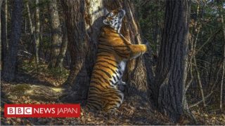 「ヒョウ国立公園」で、メスのトラが木を抱きしめている。樹皮に体をこすりつけ、縄張りを示すためににおいを残そうとしている。