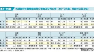 15〜39歳の各年代の死因は自殺が最多で、がんなどの病気や不慮の事故を上回る。15〜34歳で比較した世界保健機関(WHO)の資料によると、先進国で死因1位が自殺なのは日本だけで、韓国と並んで若年層の自殺が深刻化している。