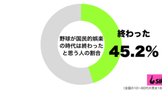 しらべぇ編集部では全国10?60代の男女1,844名を対象に調査したところ、全体の45.2%が「野球が国民的娯楽の時代は終わったと思う」と回答した。