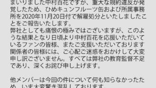 「2代目ひめキュンフルーツ缶リーダーとして活動してまいりました中村百花ですが、重大な規約違反が発覚したため、ひめキュンフルーツ缶および所属事務所を2020年11月20日付で解雇処分といたしましたことをご報告いたします」と発表した。