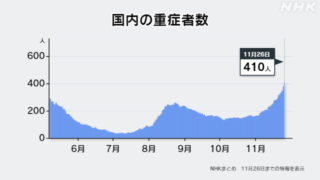 一方、重症患者の数は26日の時点で410人で、第1波で最も多かった4月30日時点の328人を上回り、すでに過去最多を更新しています。