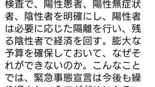 膨大な予算を確保しておいて、なぜそれができないのか。こんなことでは、緊急事態宣言は今後も繰り返され、全てがだめになる。