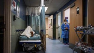 米カリフォルニア州の病院で満床のため廊下で寝る入院患者(2021年1月3日撮影)