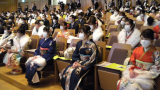 会場周辺には振袖姿の女性がたくさん集まった。旧友との再会にハグし合う姿も見られた。会場内では一席ずつ空けて着席。式典の司会からは冒頭、「この会が新規感染の場になることが危惧されています。自覚ある行動をお願いします。式典終了後の宴会はご控えいただき、すみやかに帰宅をお願いします」と呼びかけがあった。