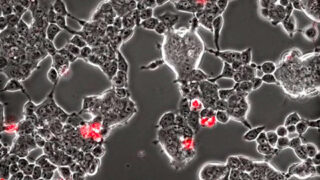 10分ごとに記録された画像で48時間にわたって撮影されたこの映像は、コウモリの脳細胞である灰色の塊の塊の間を循環する赤い斑点としてコロナウイルスを示しています。