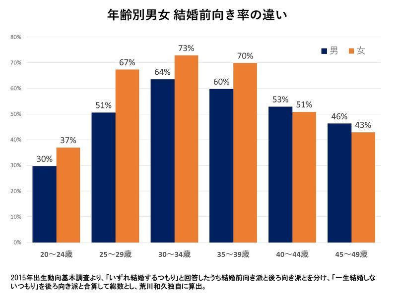 2015年出生動向基本調査に基づき、より詳細に年代別での結婚前向き度の男女差を見てみよう。