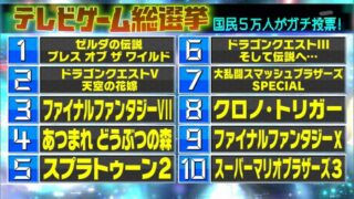 「テレビゲーム総選挙」は、各ユーザーがアンケートで答えた“好きなゲームベスト5”の調査をもとに、日本でもっとも人気のゲームTOP100を決めるという番組だ。